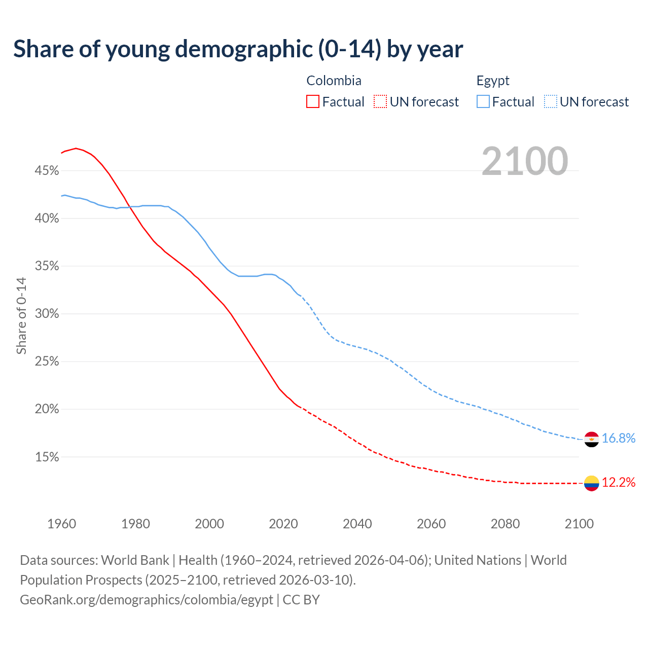 - The share of young demographic (0-15 years old) in Colombia is 20.3% vs 32% in Egypt.