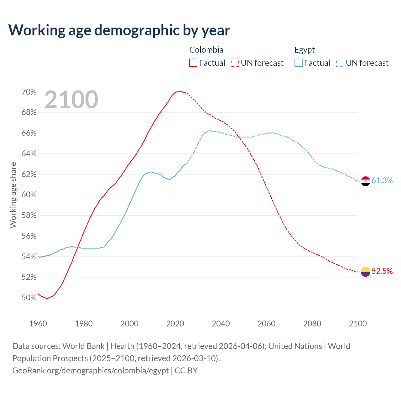 Median age Colombia vs Egypt, 1960-2100