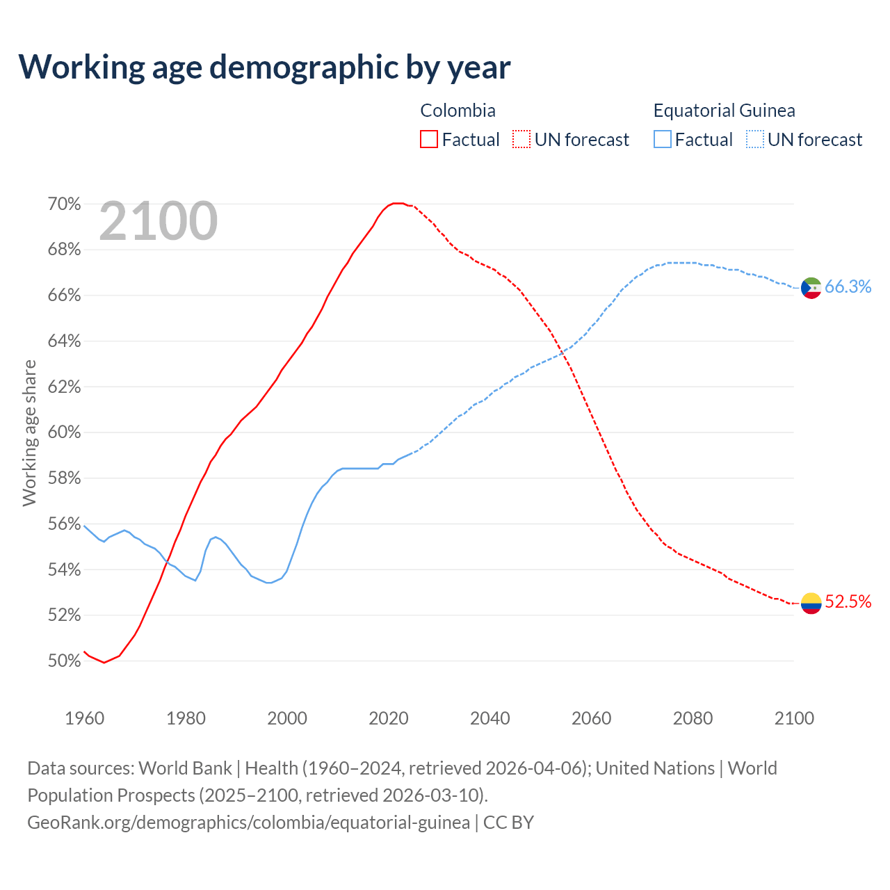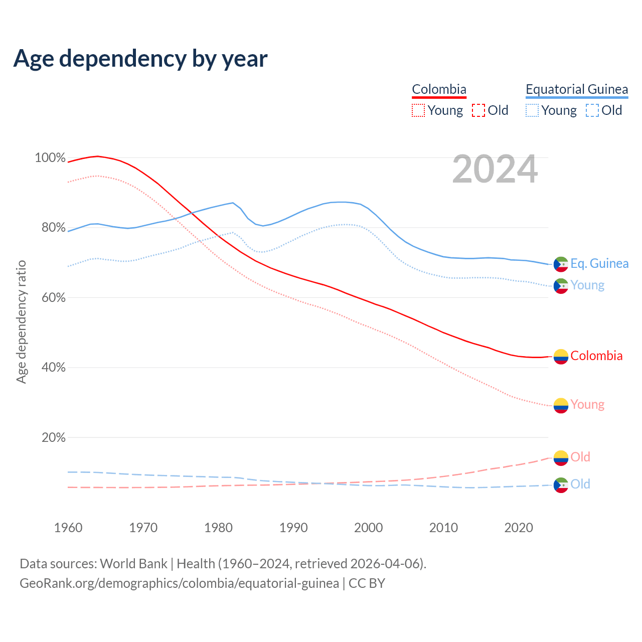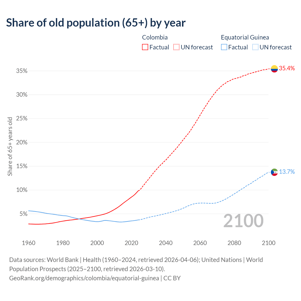 - The share of old-age demographic (65+) in Colombia is 9.78% vs 3.69% in Equatorial Guinea.