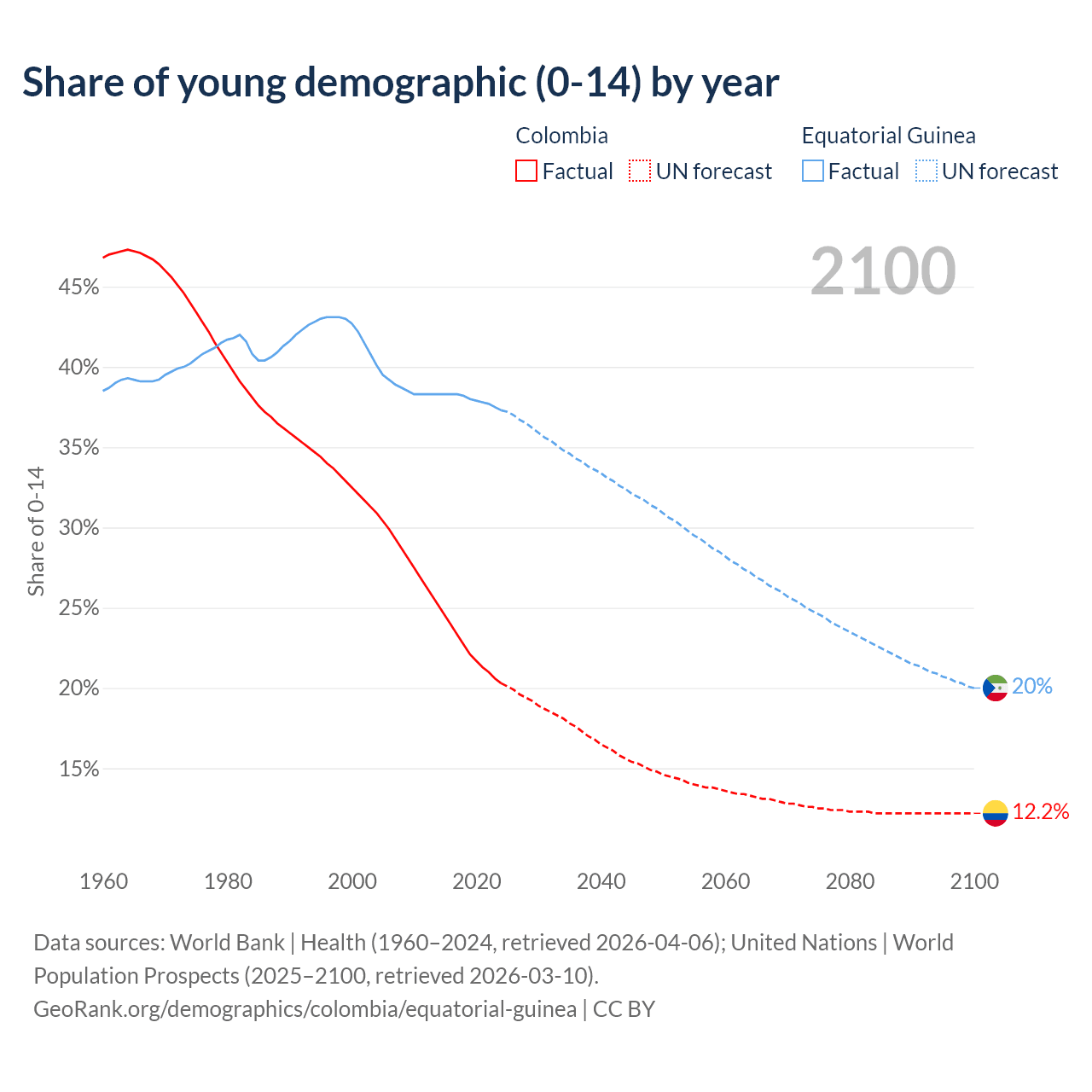 - The share of young demographic (0-15 years old) in Colombia is 20.3% vs 37.3% in Equatorial Guinea.