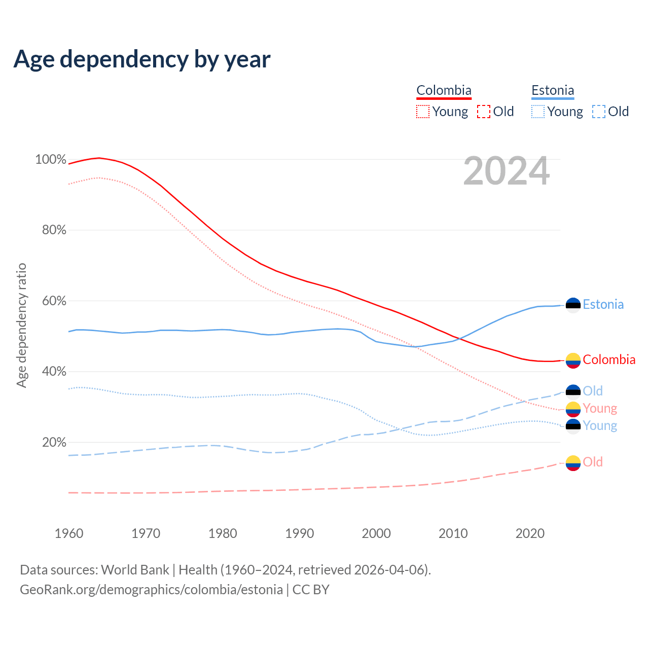 Data sources: World Bank | Health (1960–2024, retrieved 2026-04-06); U.S. Census Bureau (1960–2024, retrieved 2026-02-08).