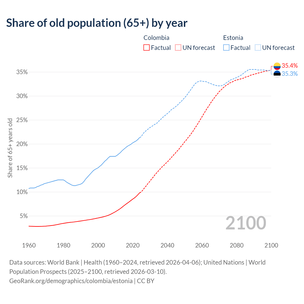 Median age Colombia vs Estonia, 1960-2100