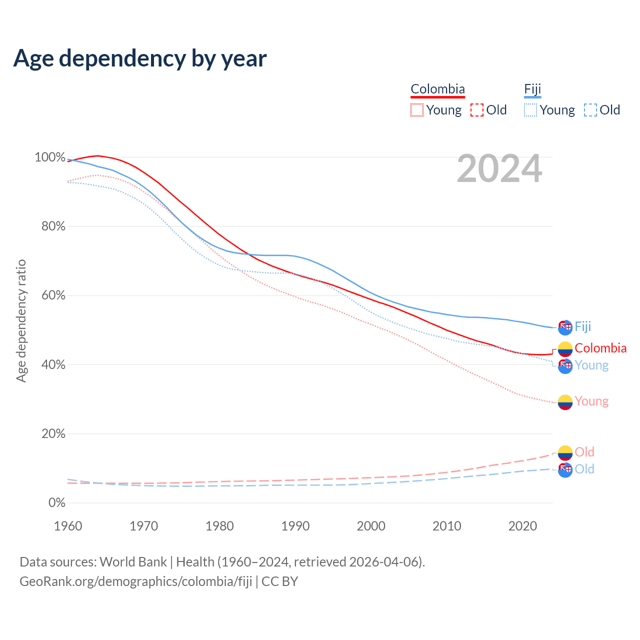 - The share of old-age demographic (65+) in Colombia is 9.78% vs 6.49% in Fiji.