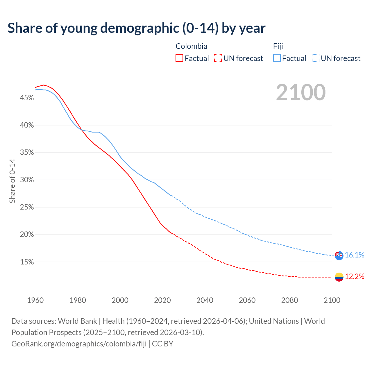 - The share of young demographic (0-15 years old) in Colombia is 20.3% vs 27.1% in Fiji.