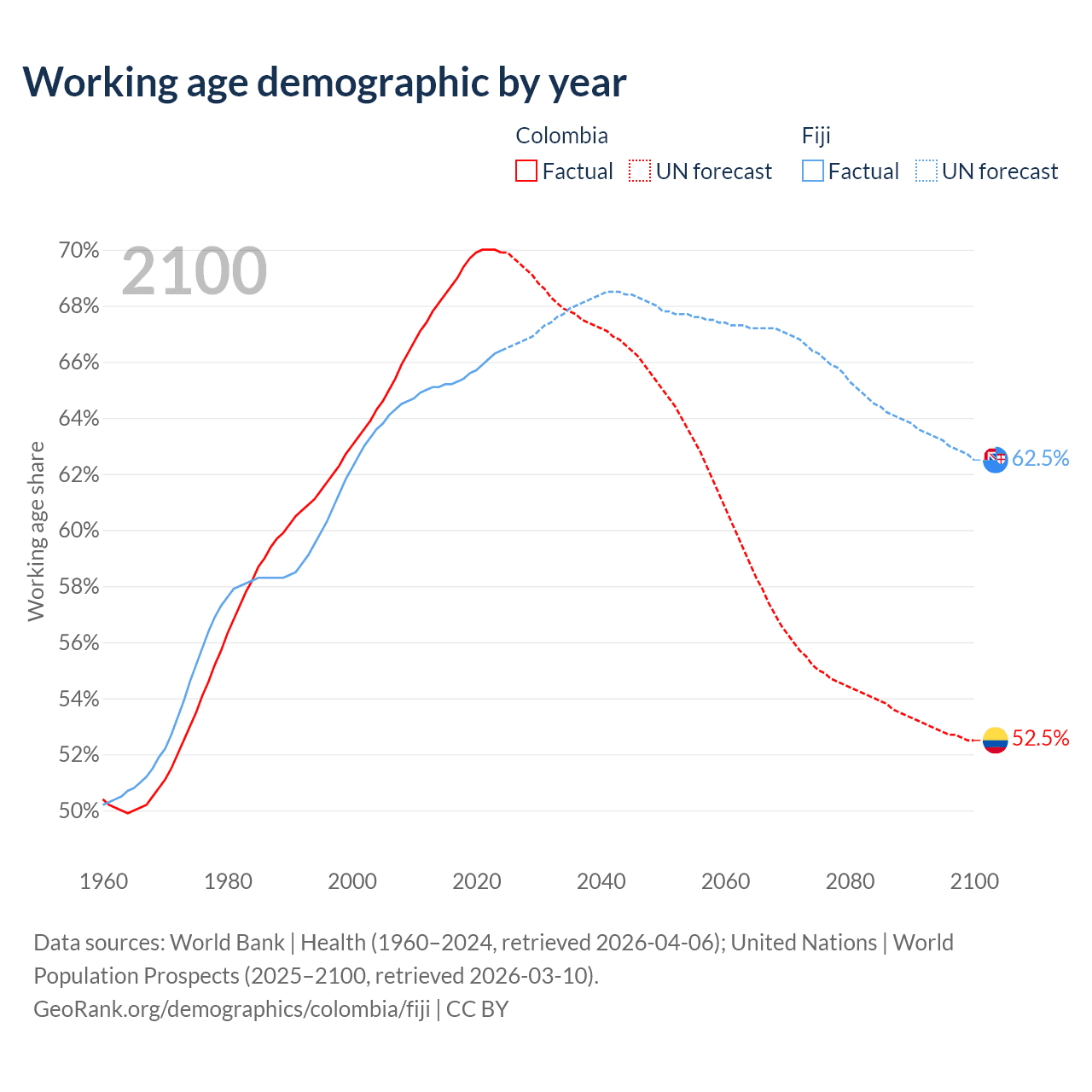 - Colombia has 37.8M working age adults (aged 15-64) vs 623K in Fiji.