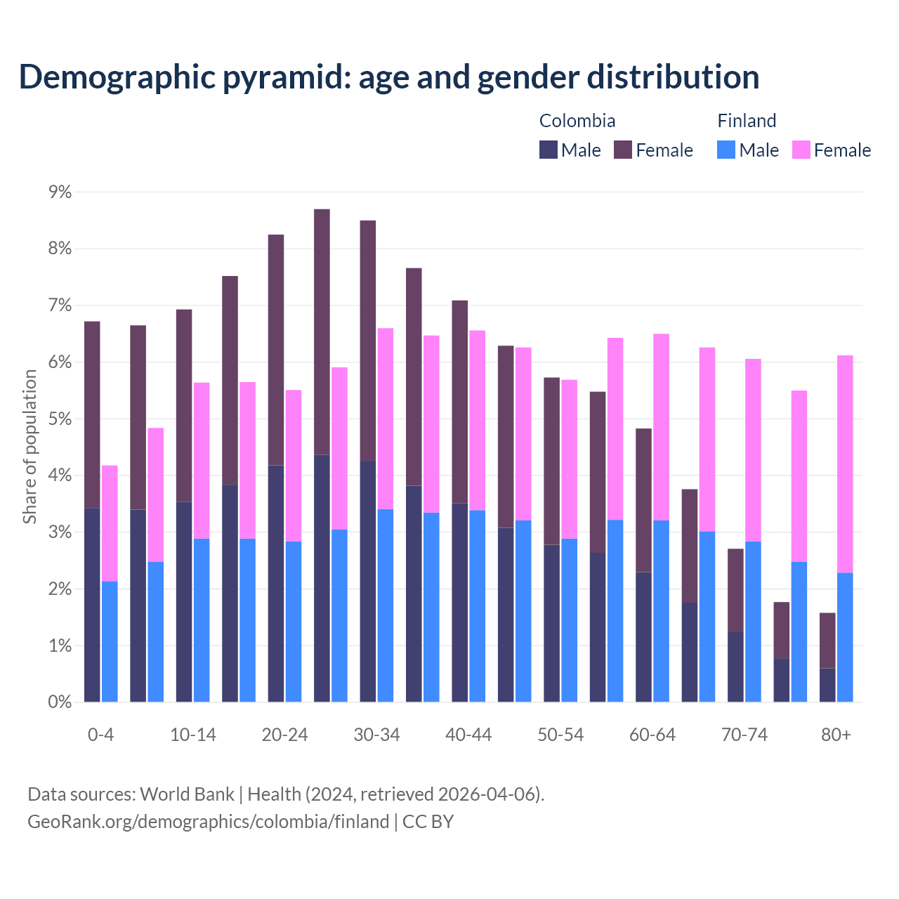 - Colombia is ranked 89/196 by median age (oldest to youngest) vs 22/196 for Finland.