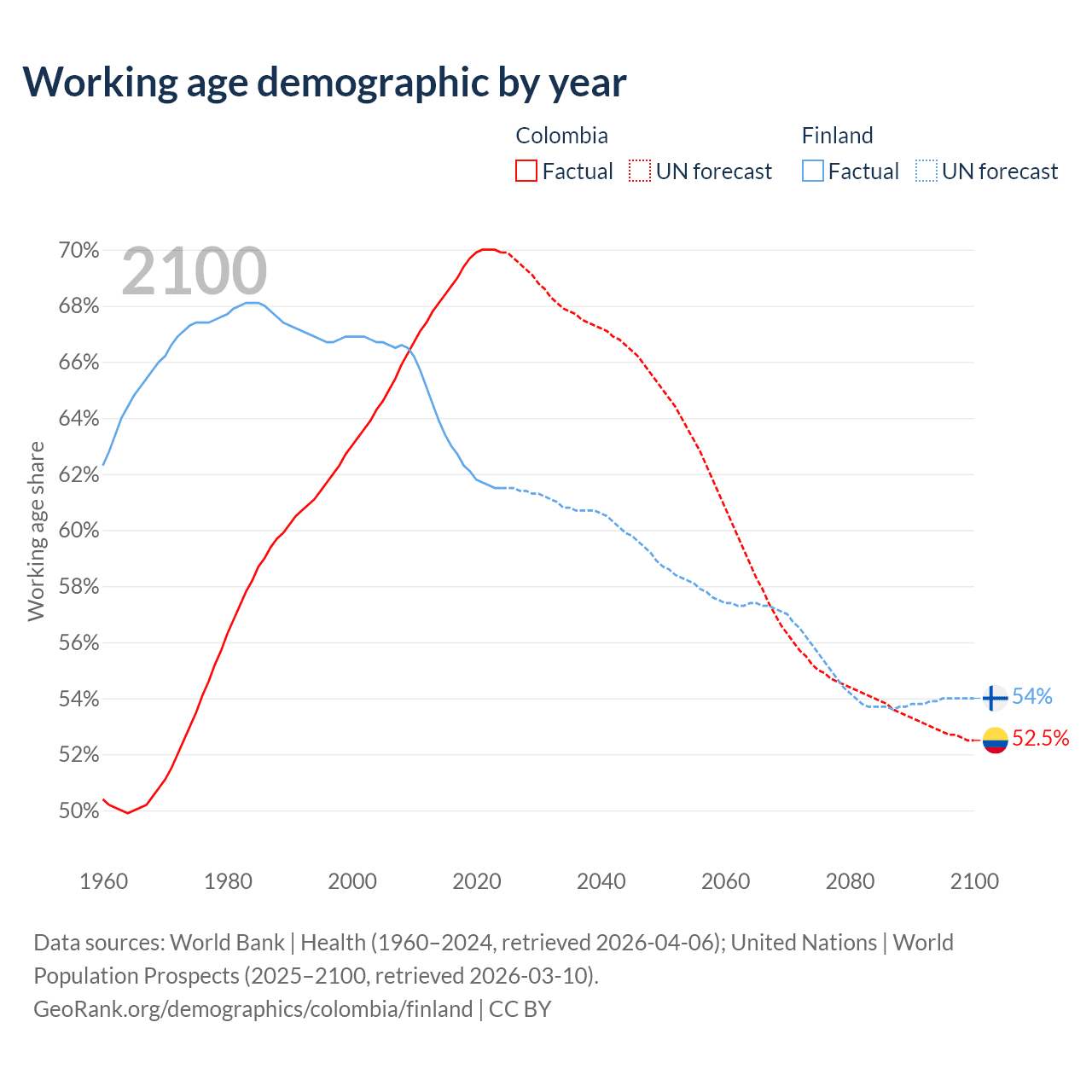 - Colombia has 37.8M working age adults (aged 15-64) vs 3.46M in Finland.
