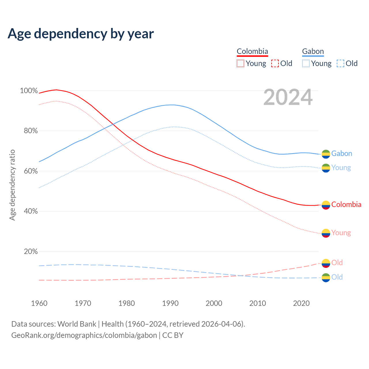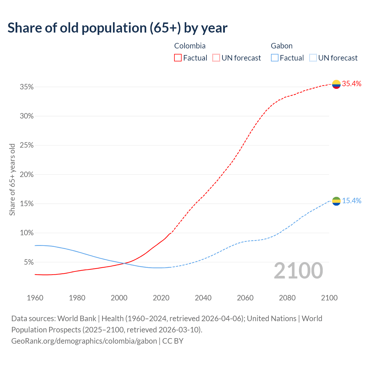 - The share of old-age demographic (65+) in Colombia is 9.78% vs 4.08% in Gabon.