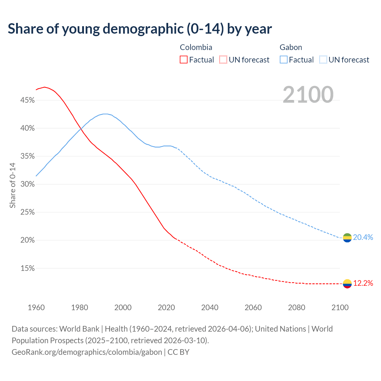 - The share of young demographic (0-15 years old) in Colombia is 20.3% vs 36.5% in Gabon.