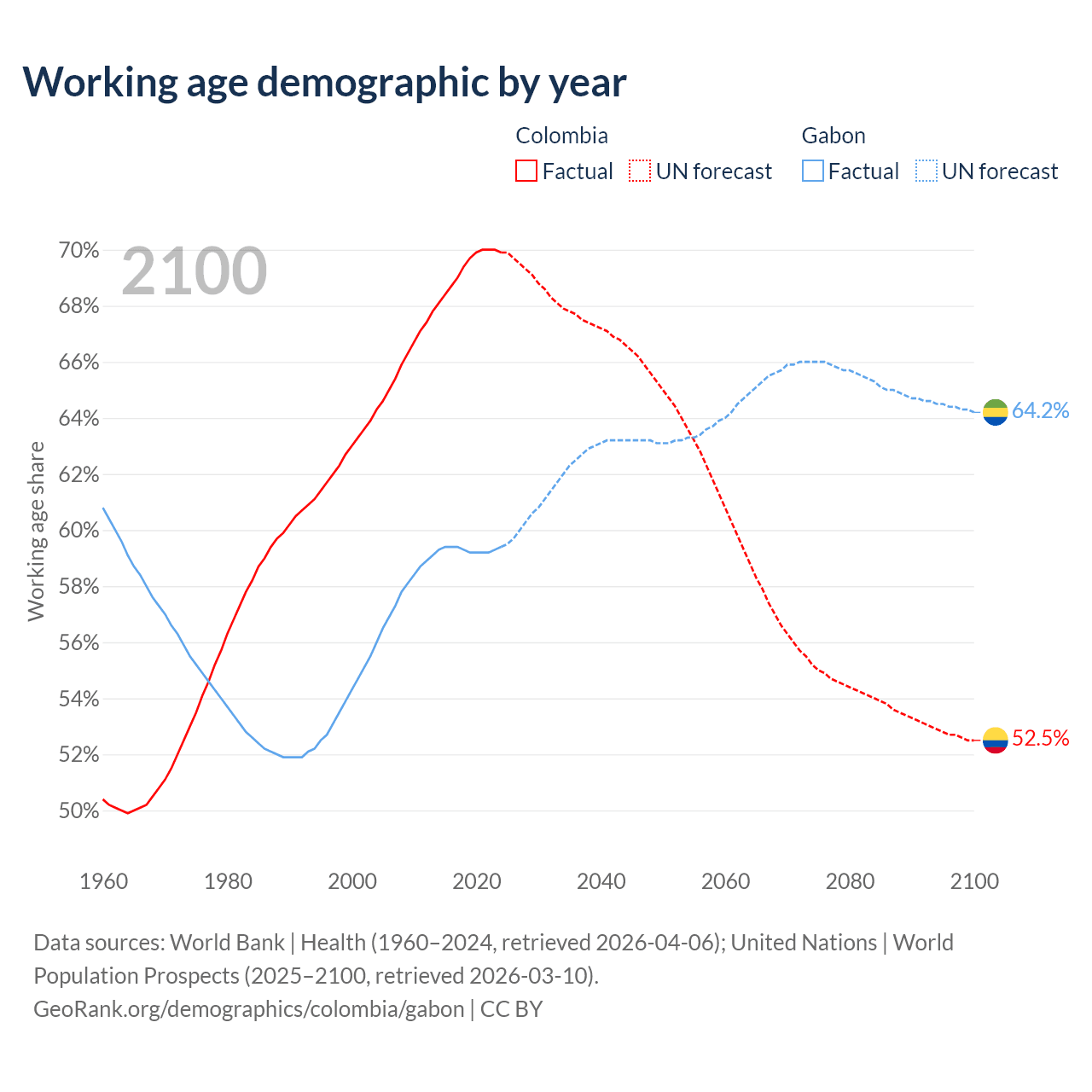 - Colombia has 37.8M working age adults (aged 15-64) vs 1.58M in Gabon.