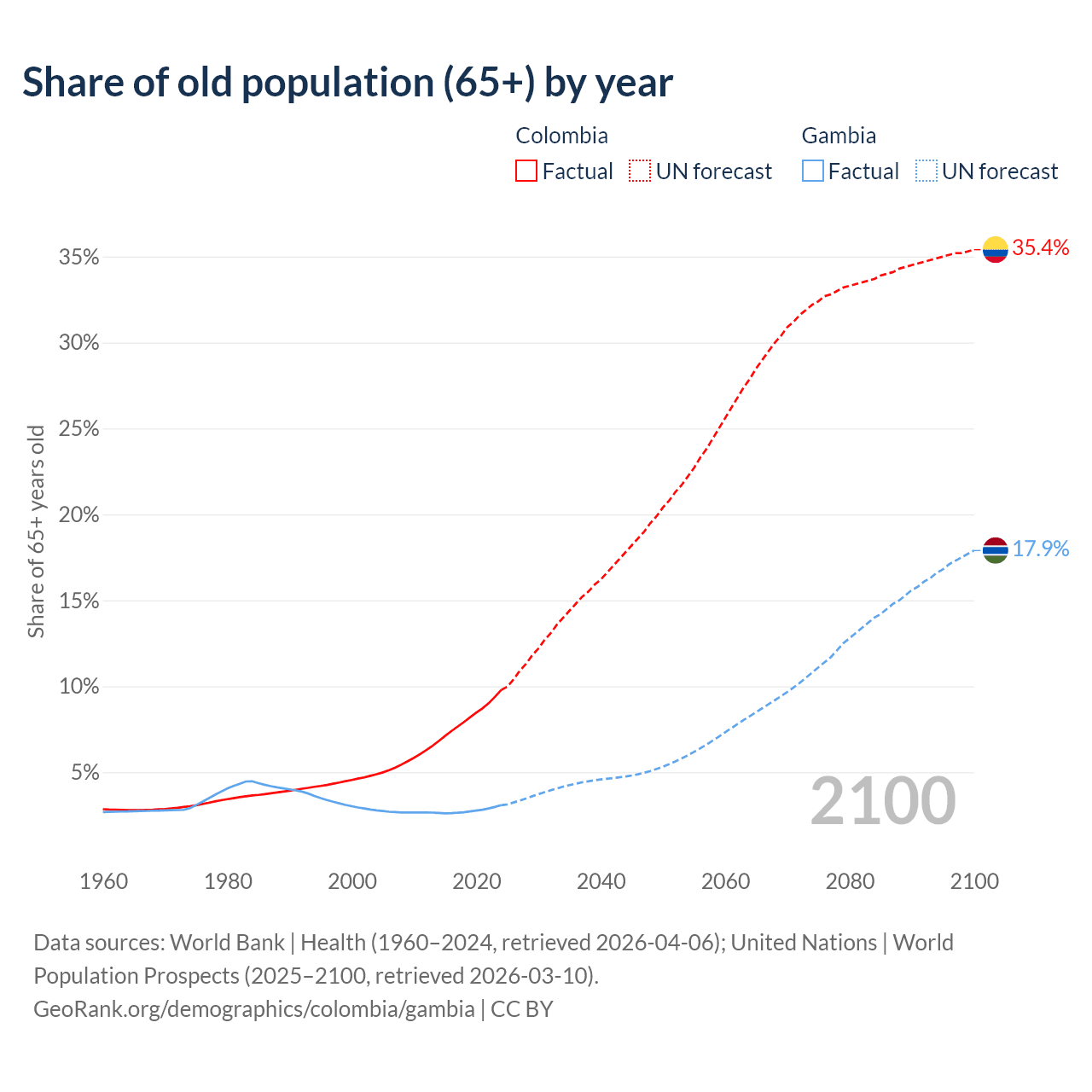 - The share of old-age demographic (65+) in Colombia is 9.78% vs 3.08% in the Gambia.