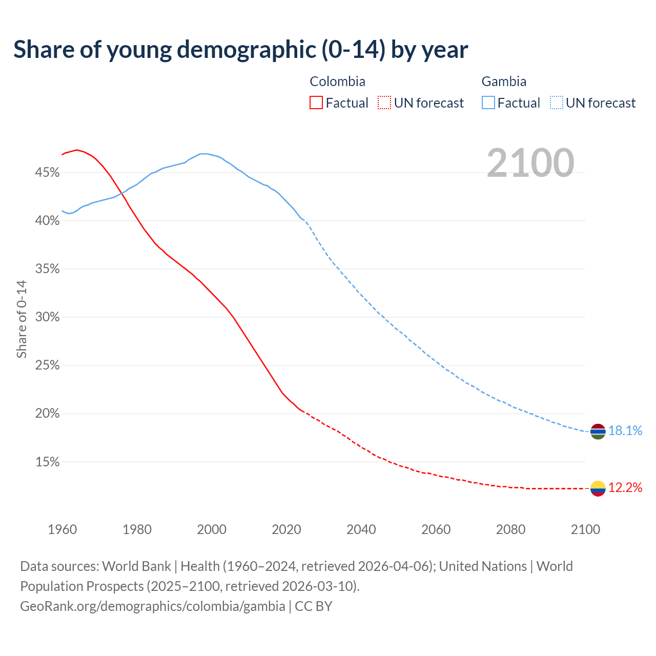 - The share of young demographic (0-15 years old) in Colombia is 20.3% vs 40.2% in the Gambia.