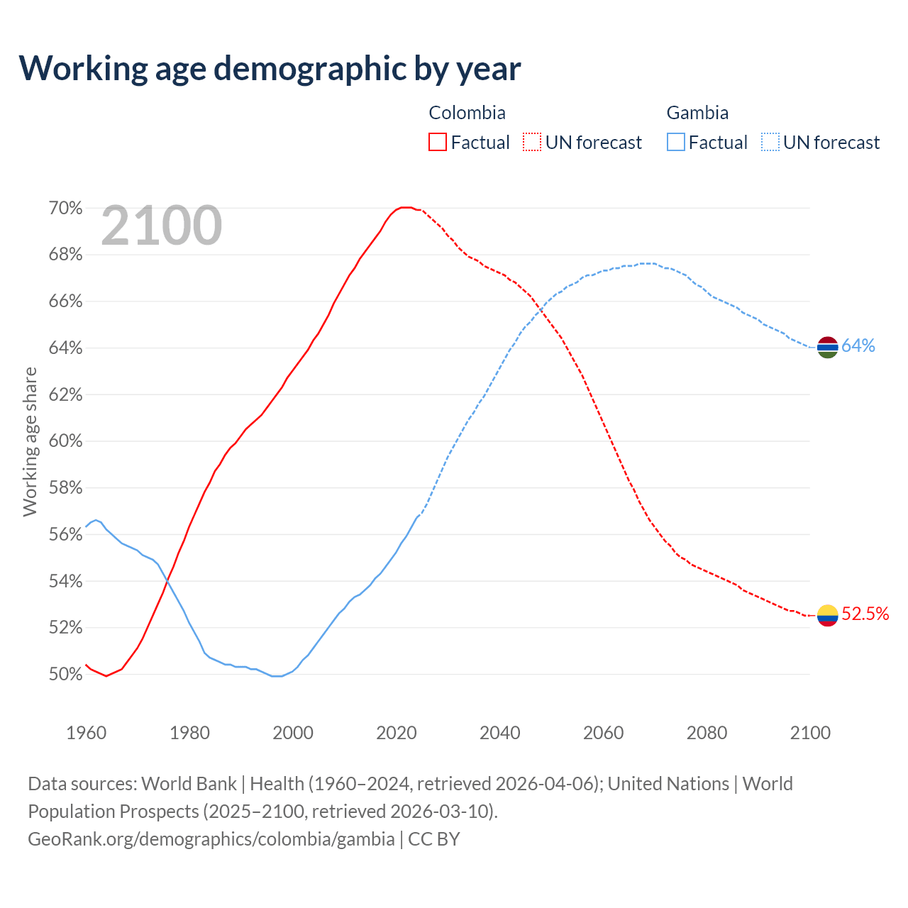 - Colombia has 37.8M working age adults (aged 15-64) vs 1.64M in the Gambia.