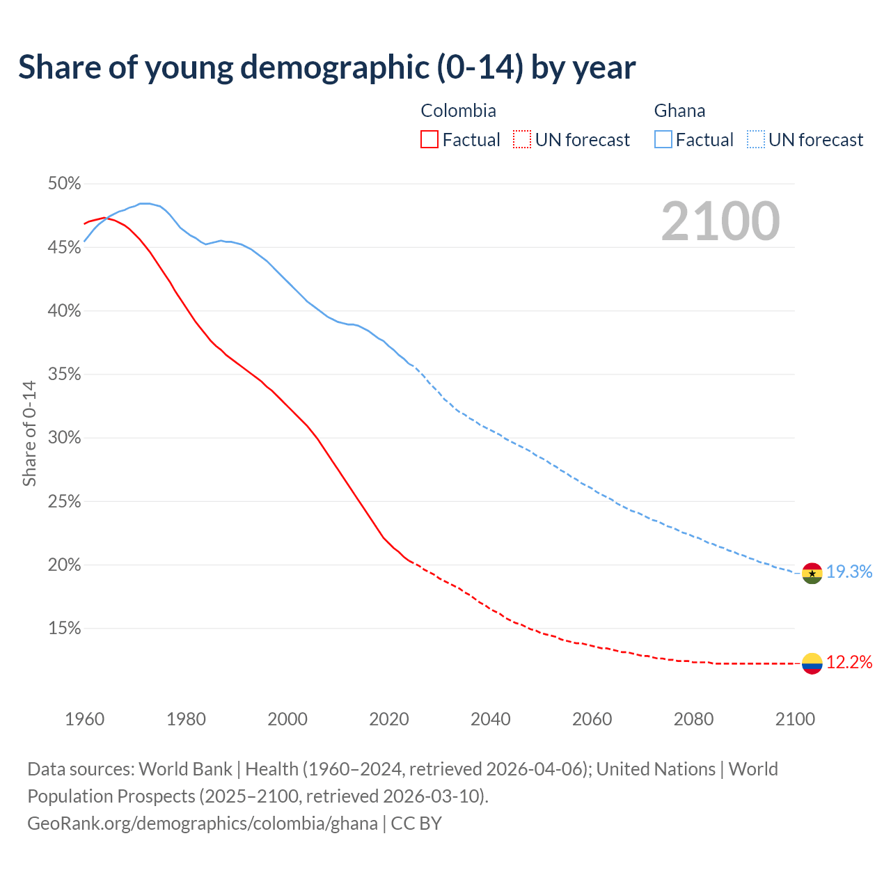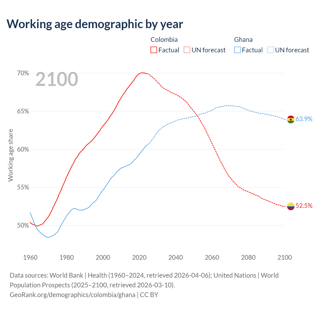 Median age Colombia vs Ghana, 1960-2100