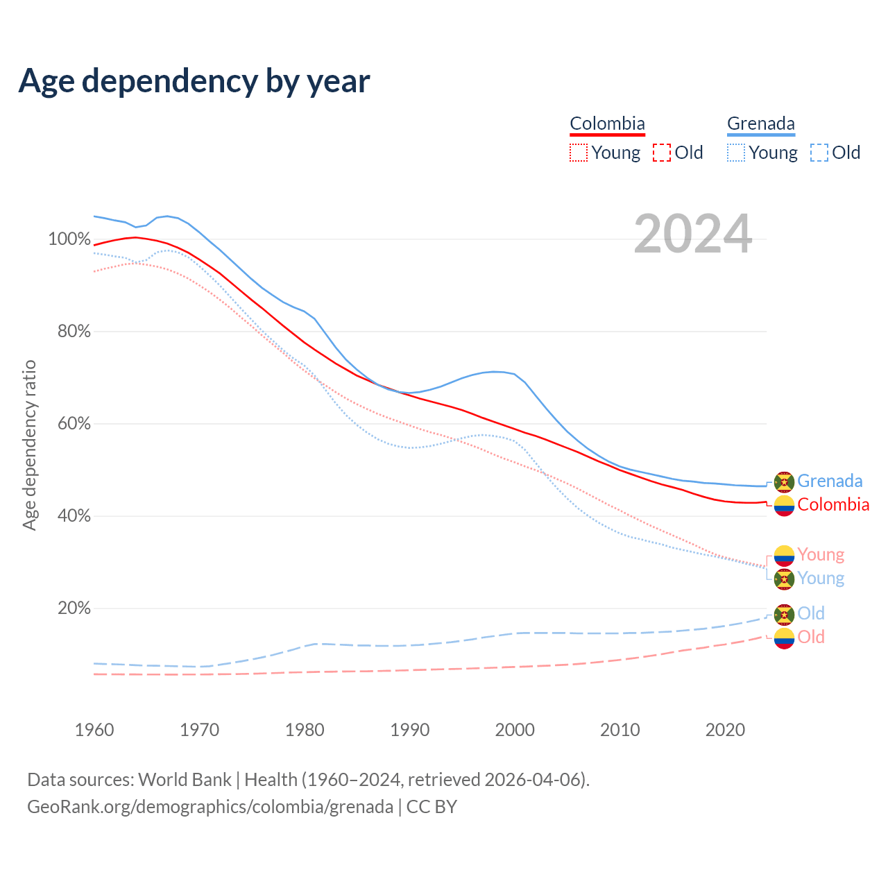 Data sources: World Bank | Health (1960–2024, retrieved 2026-04-06); U.S. Census Bureau (1960–2024, retrieved 2026-02-08).