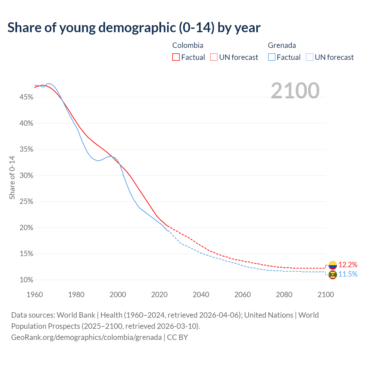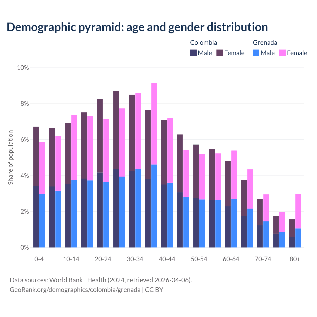 - The share of young demographic (0-15 years old) in Colombia is 20.3% vs 19.4% in Grenada.