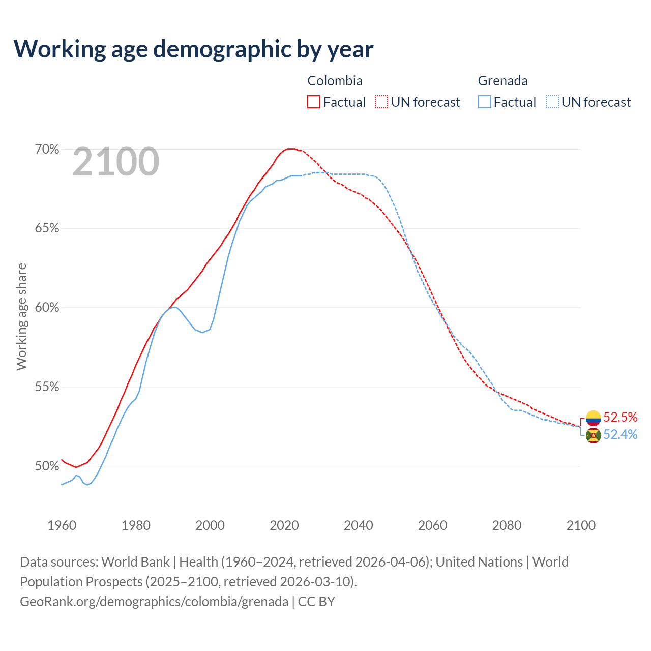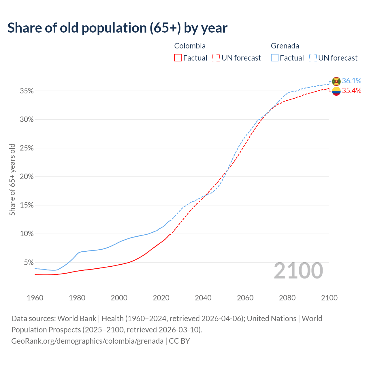 Median age Colombia vs Grenada, 1960-2100