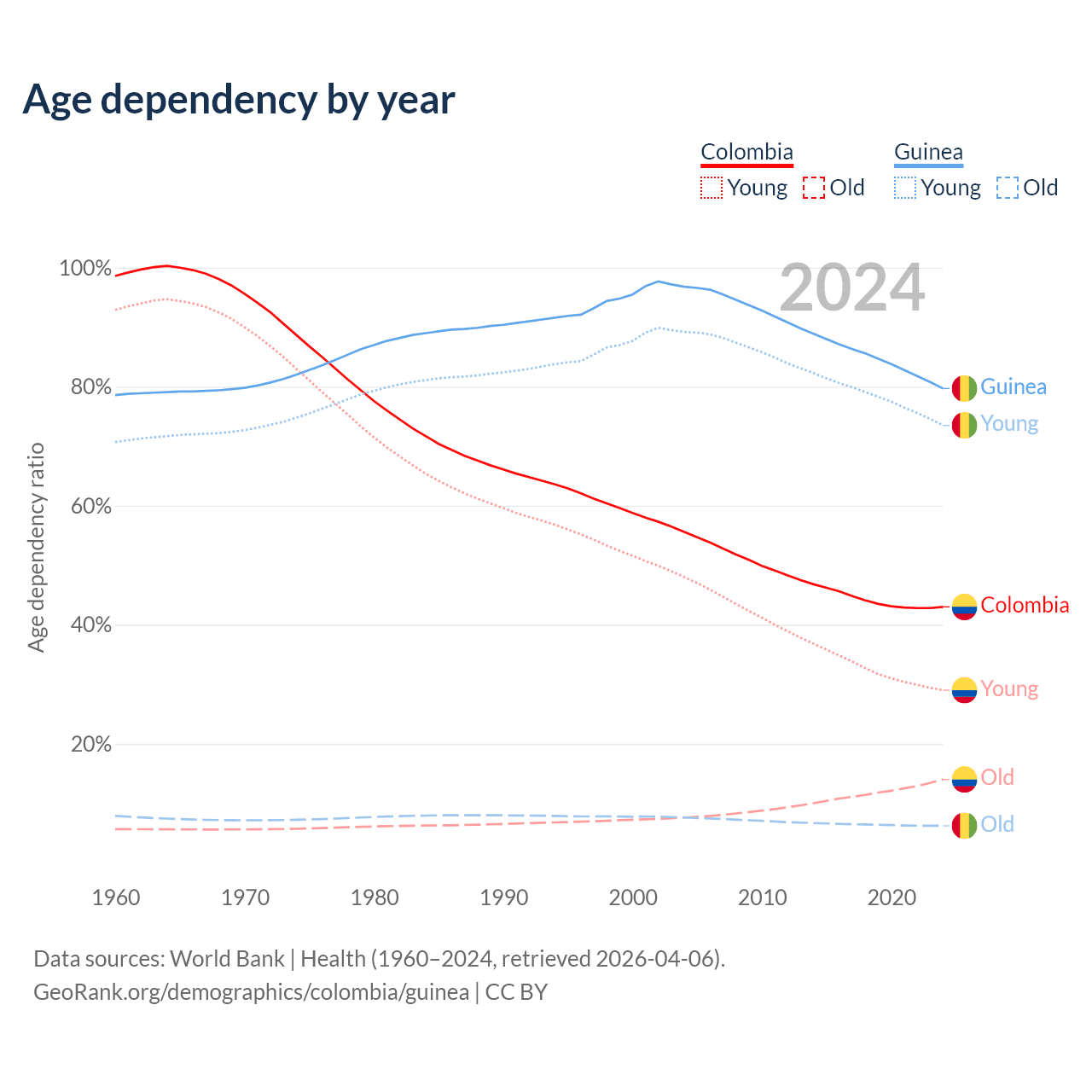 - The share of old-age demographic (65+) in Colombia is 9.78% vs 3.46% in Guinea.
