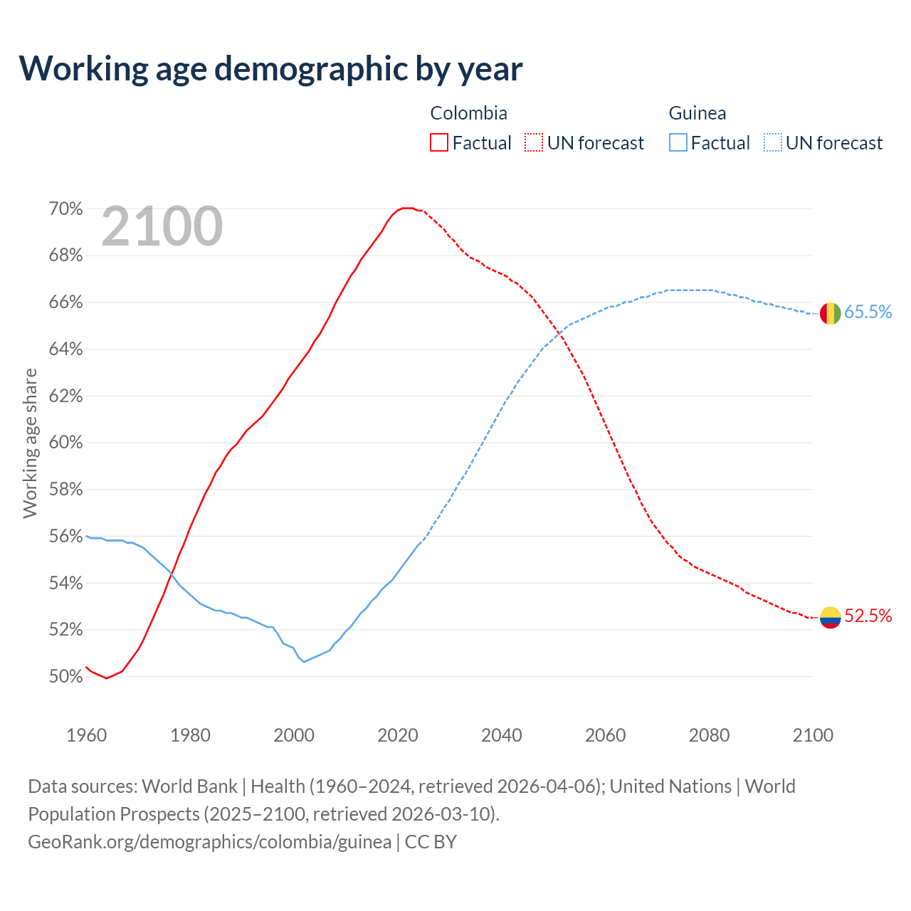 Median age Colombia vs Guinea, 1960-2100