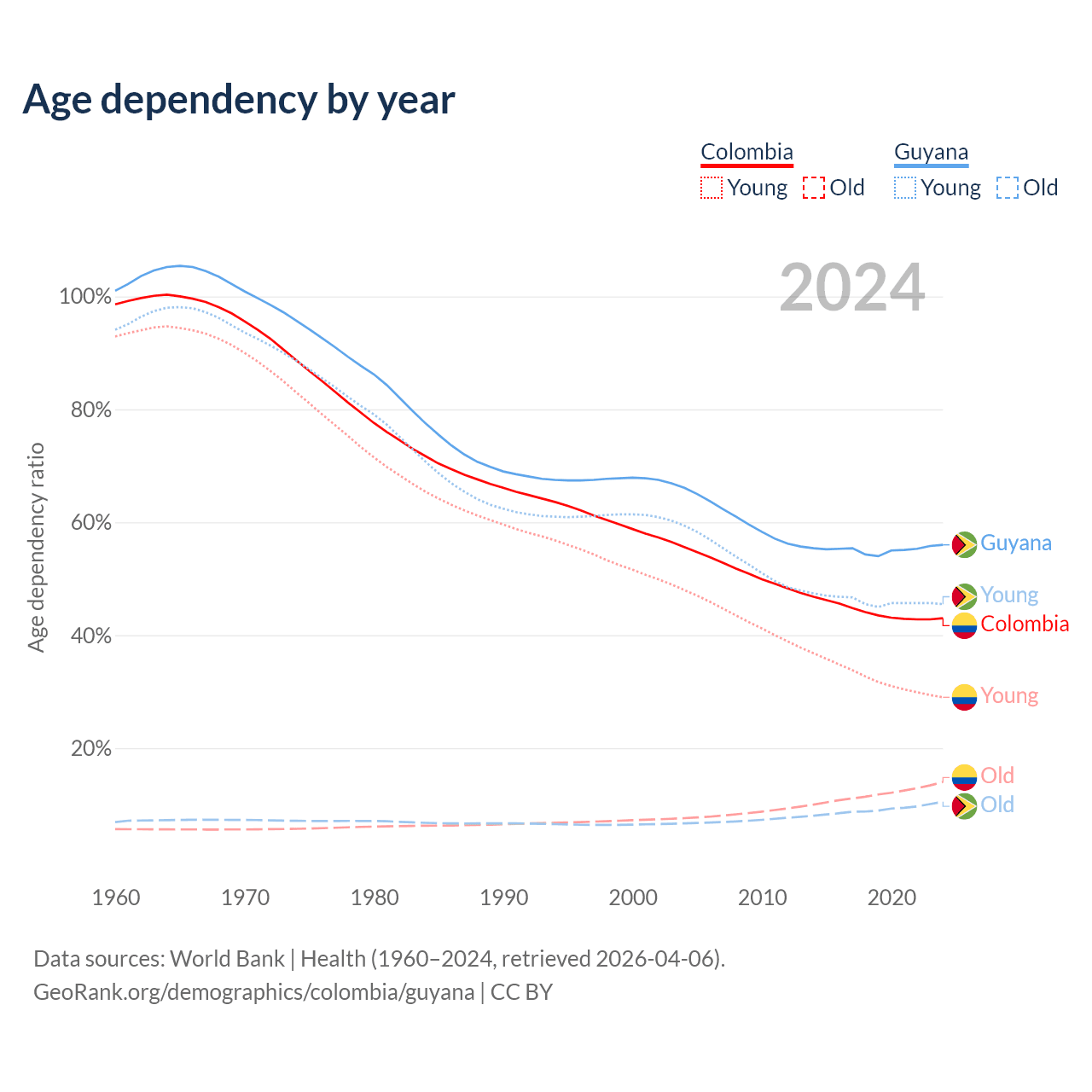 - Colombia is ranked 89/196 by median age (oldest to youngest) vs 122/196 for Guyana.
