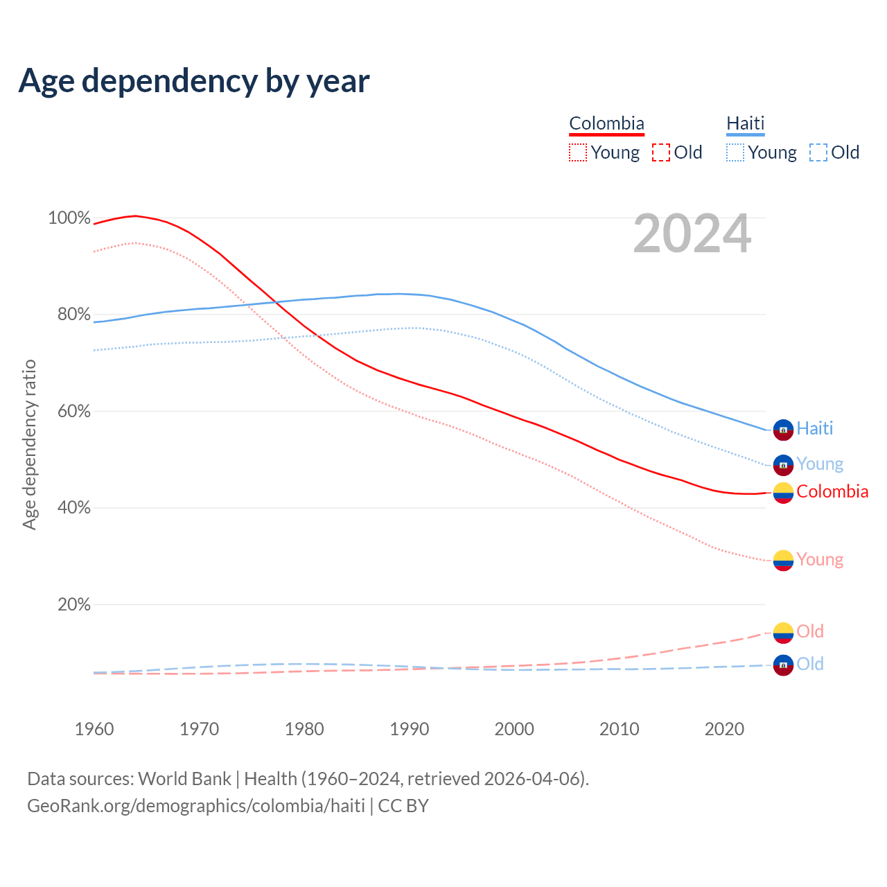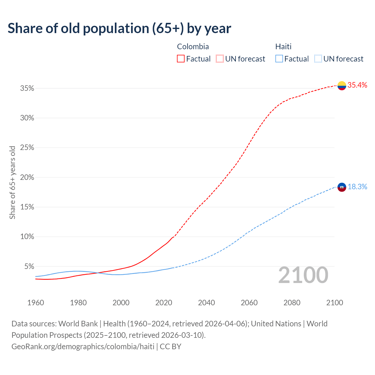 - The share of old-age demographic (65+) in Colombia is 9.78% vs 4.71% in Haiti.
