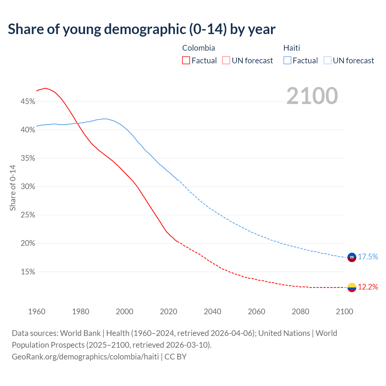 - The share of young demographic (0-15 years old) in Colombia is 20.3% vs 31.2% in Haiti.