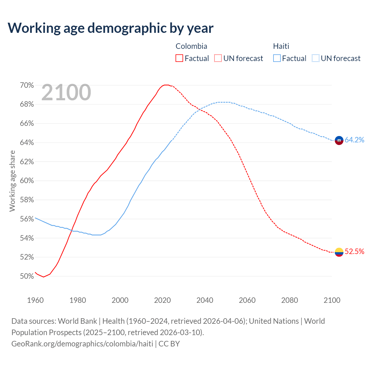 - Colombia has 37.8M working age adults (aged 15-64) vs 7.74M in Haiti.