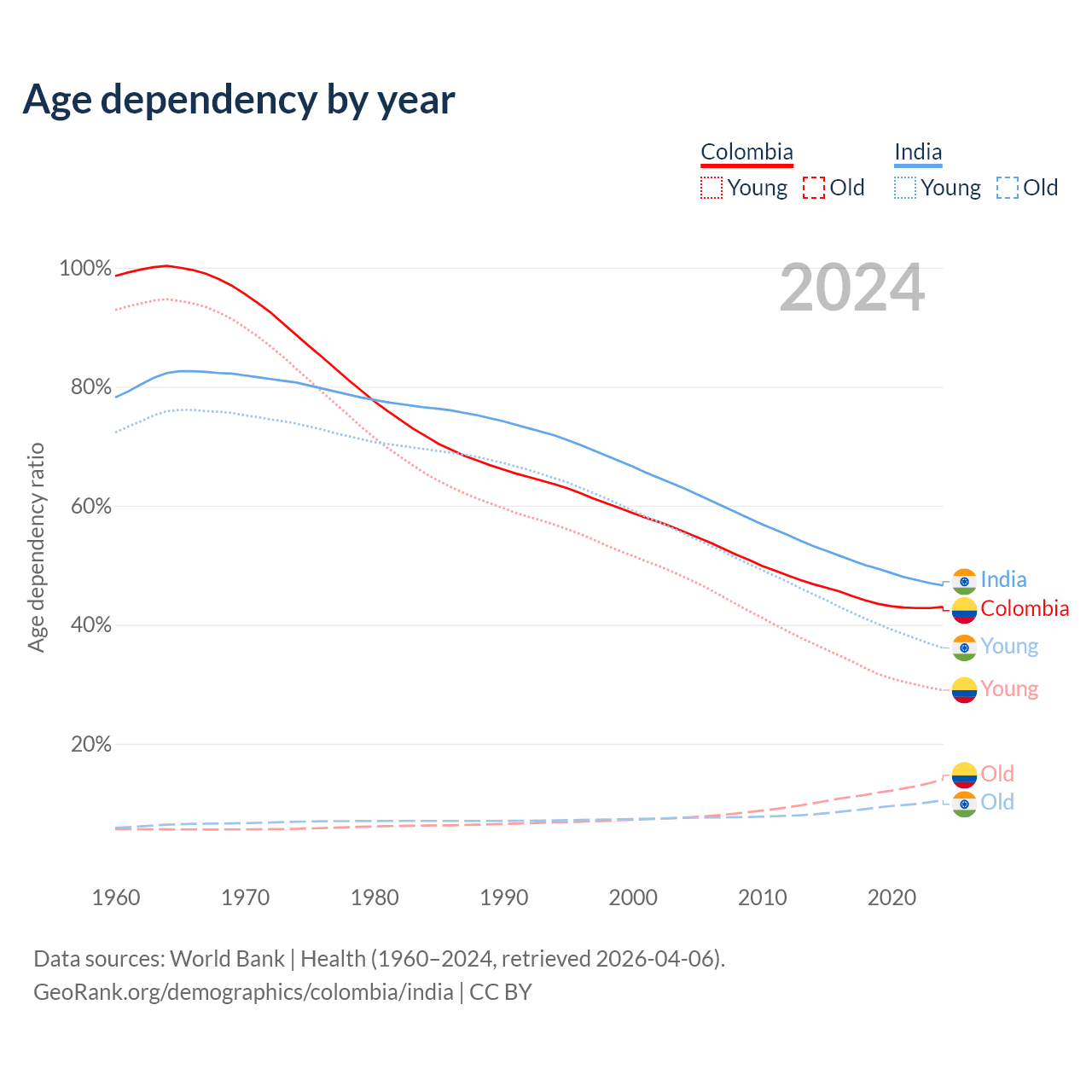 - Colombia is ranked 89/196 by median age (oldest to youngest) vs 108/196 for India.