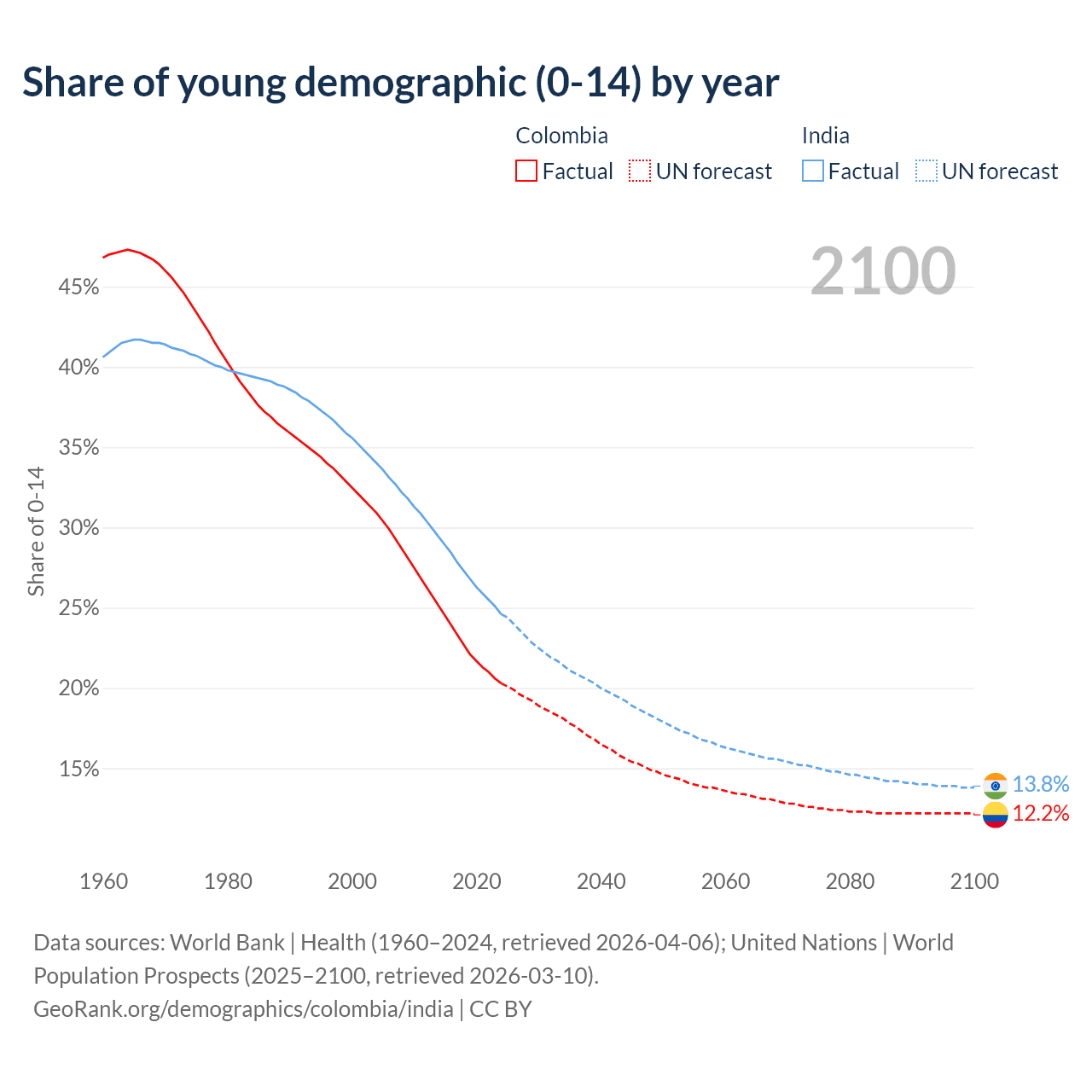 Median age Colombia vs India, 1960-2100
