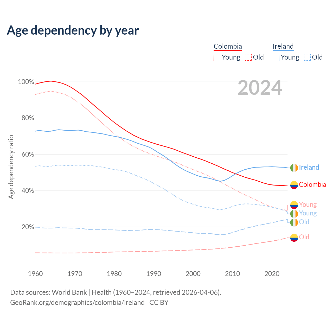 - Colombia is ranked 89/196 by median age (oldest to youngest) vs 48/196 for Ireland.