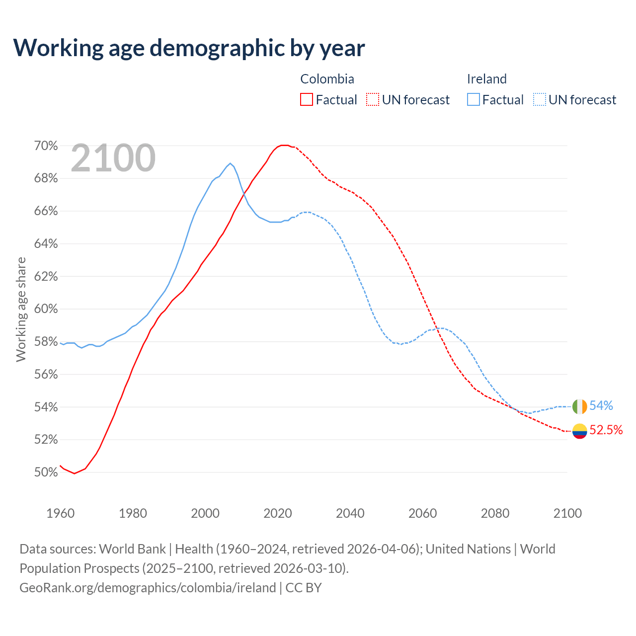 - Colombia has 37.8M working age adults (aged 15-64) vs 3.62M in Ireland.