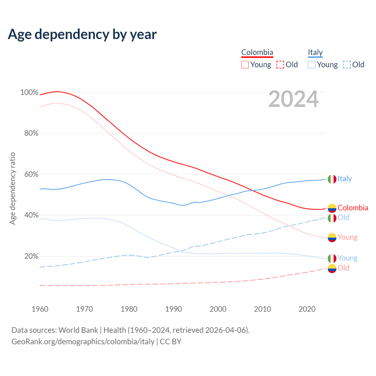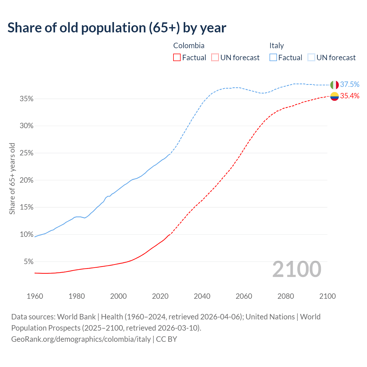 The share of older people aged 65 and over is 9.78% in Colombia and 24.6% in Italy. Life expectancy in Colombia compared to Italy .