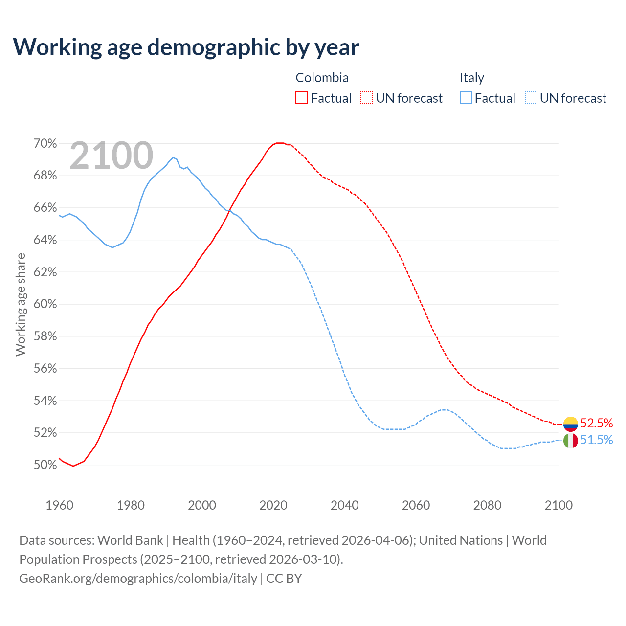 Median age Colombia vs Italy, 1960-2100