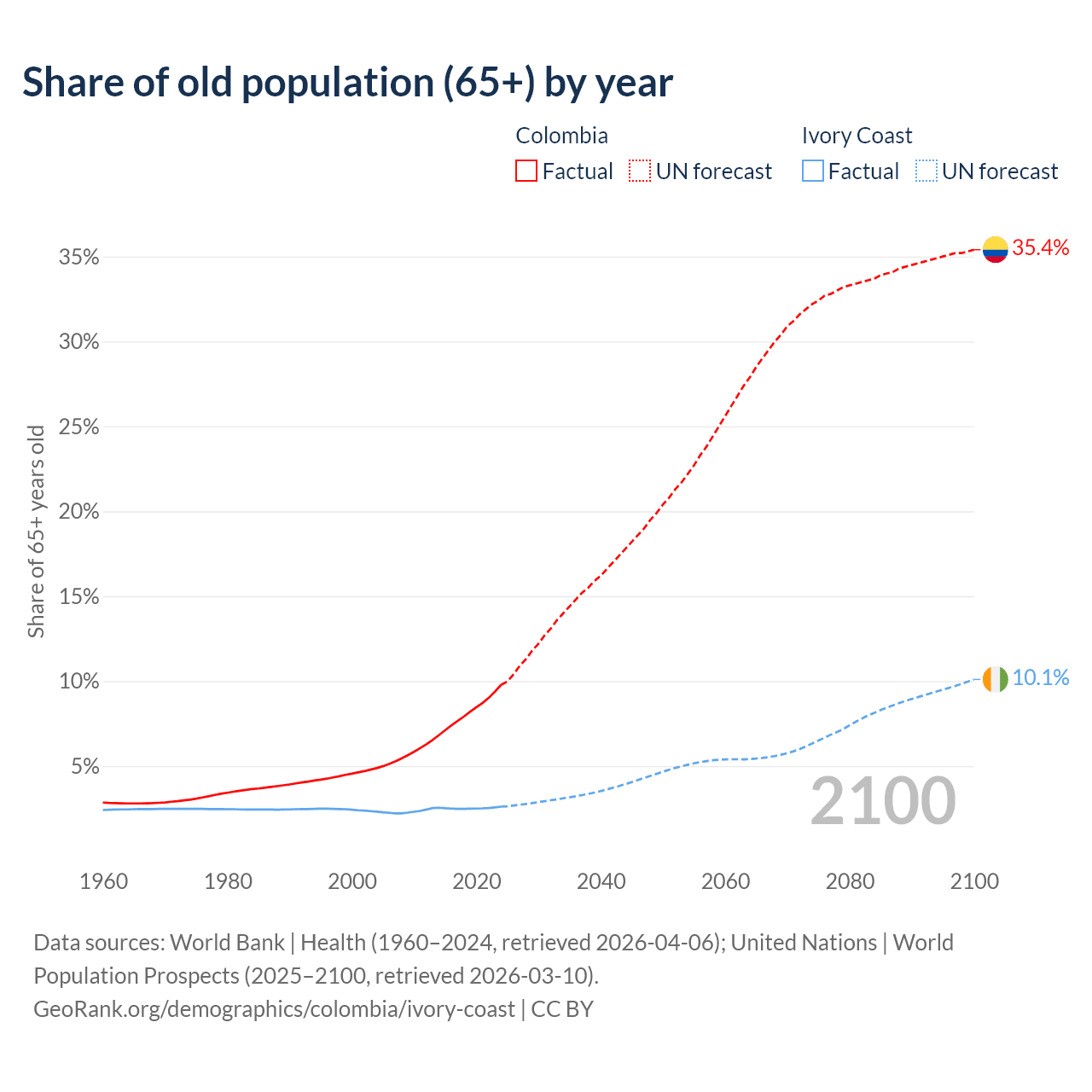 - The share of old-age demographic (65+) in Colombia is 9.78% vs 2.61% in Ivory Coast.