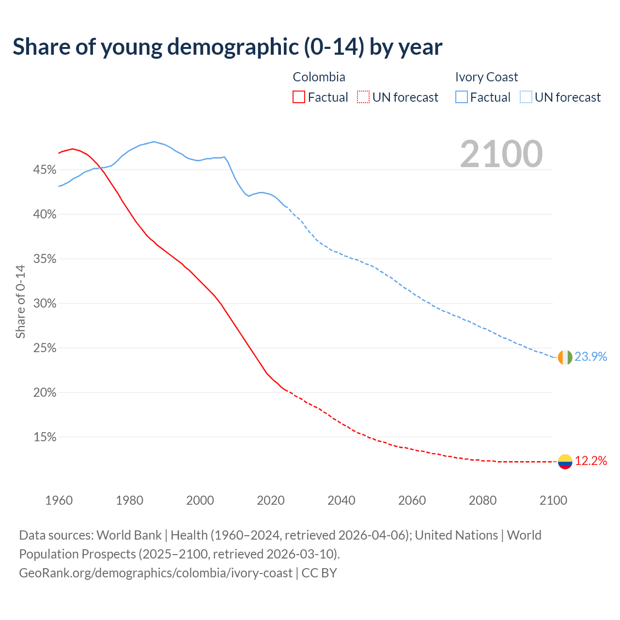 - The share of young demographic (0-15 years old) in Colombia is 20.3% vs 40.9% in Ivory Coast.