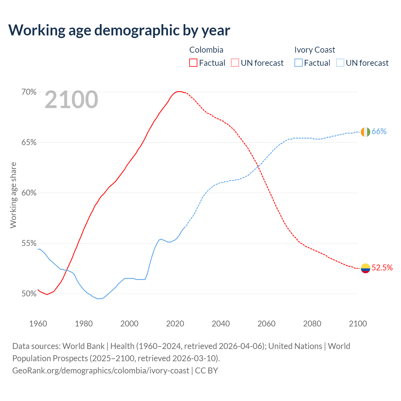 - Colombia has 37.8M working age adults (aged 15-64) vs 19.1M in Ivory Coast.