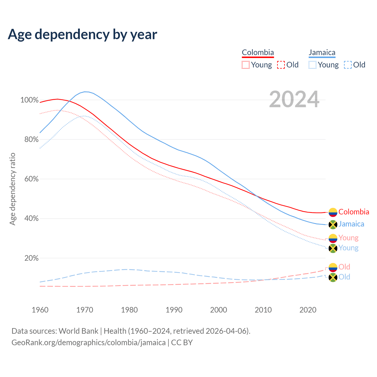 - The share of old-age demographic (65+) in Colombia is 9.78% vs 8.21% in Jamaica.