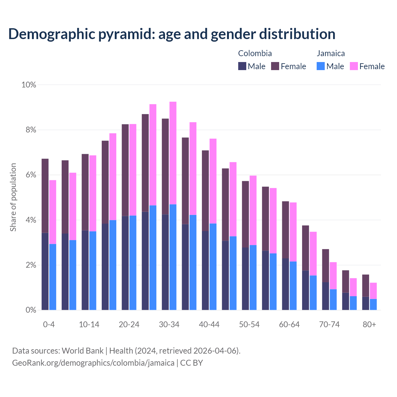 - Colombia is ranked 89/196 by median age (oldest to youngest) vs 87/196 for Jamaica.