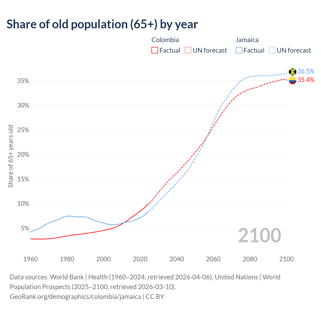 The share of older people aged 65 and over is 9.78% in Colombia and 8.21% in Jamaica. Life expectancy in Colombia compared to Jamaica .