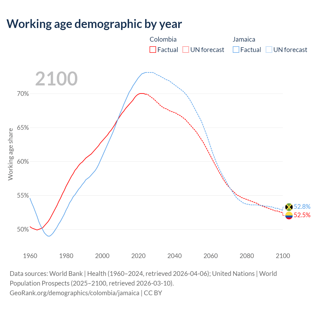 - Colombia has 37.8M working age adults (aged 15-64) vs 2.07M in Jamaica.