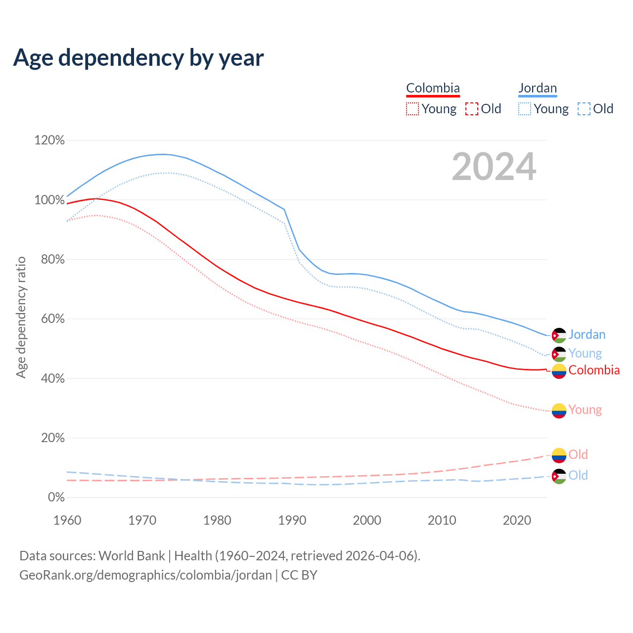 - The share of old-age demographic (65+) in Colombia is 9.78% vs 4.52% in Jordan.