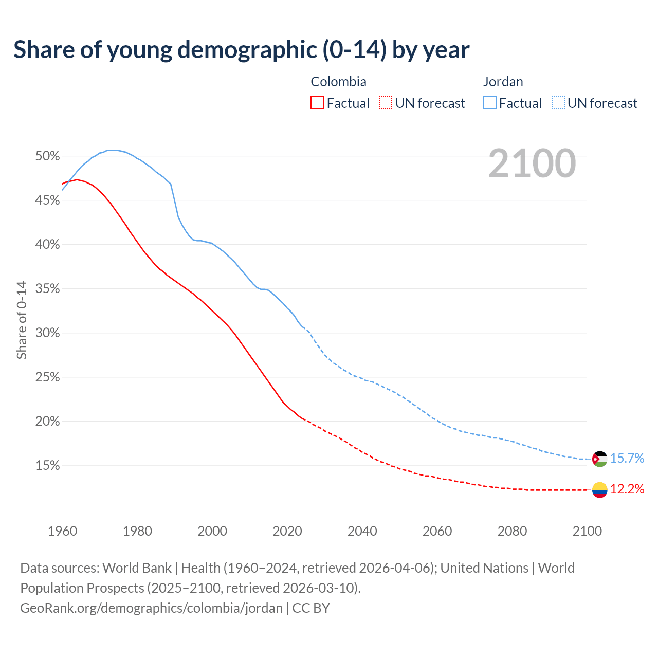 - The share of young demographic (0-15 years old) in Colombia is 20.3% vs 30.7% in Jordan.