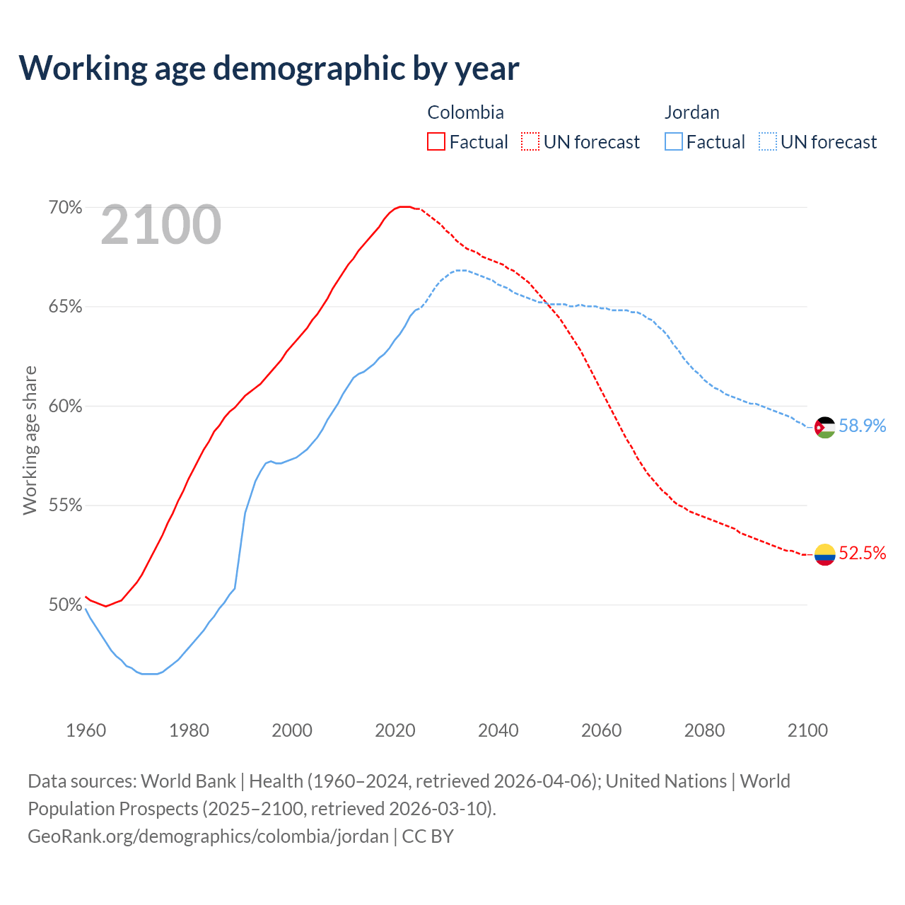 Median age Colombia vs Jordan, 1960-2100