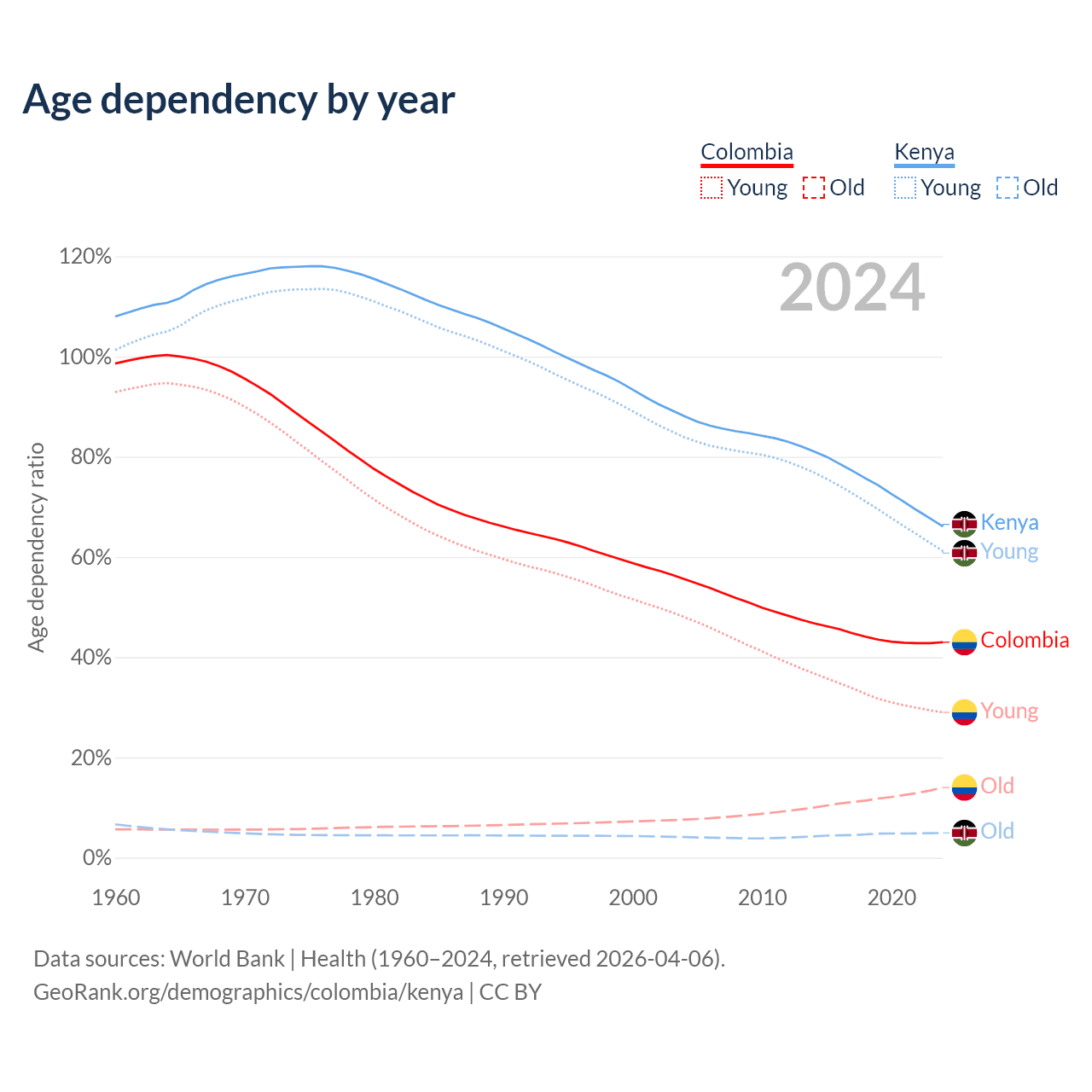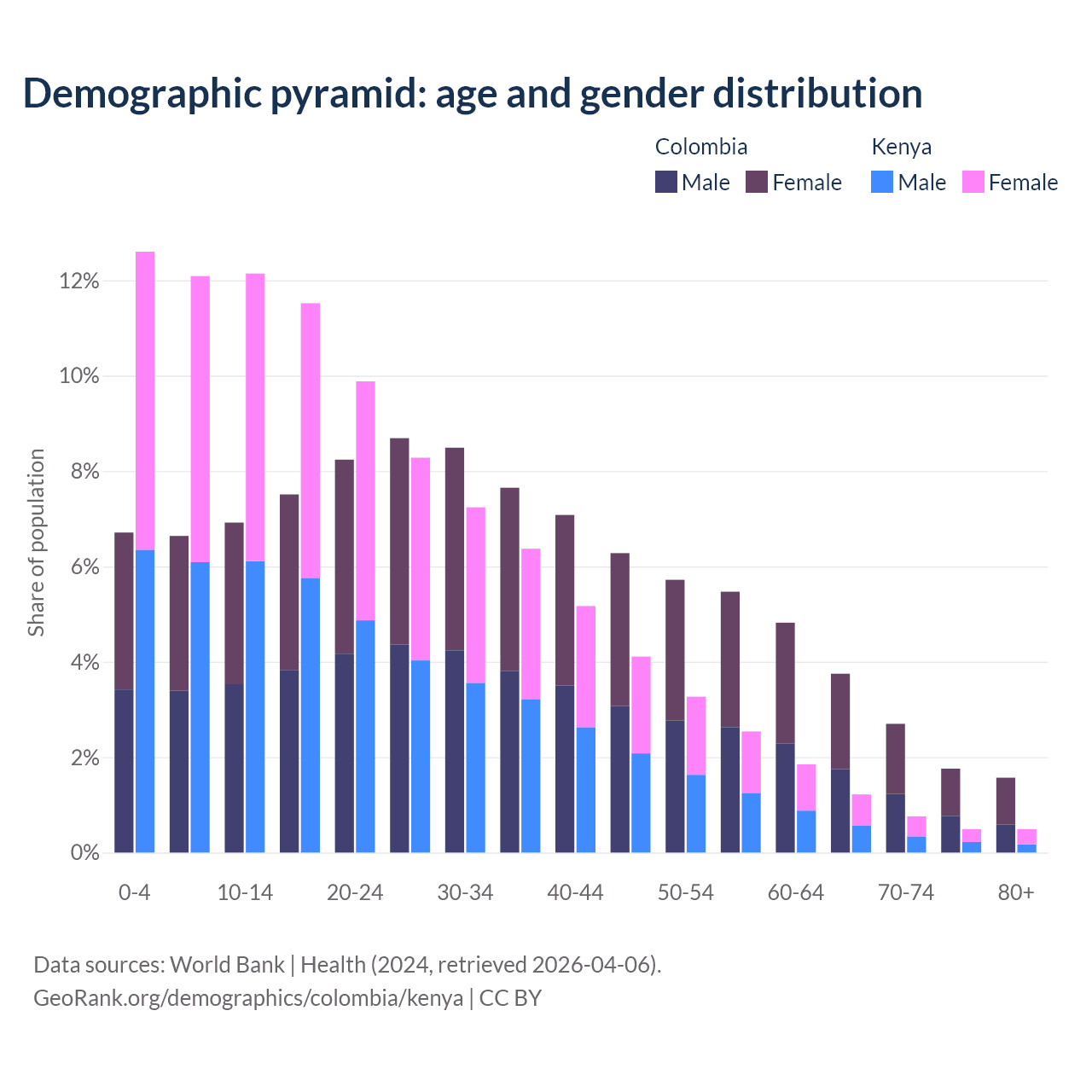 - Colombia is ranked 89/196 by median age (oldest to youngest) vs 159/196 for Kenya.