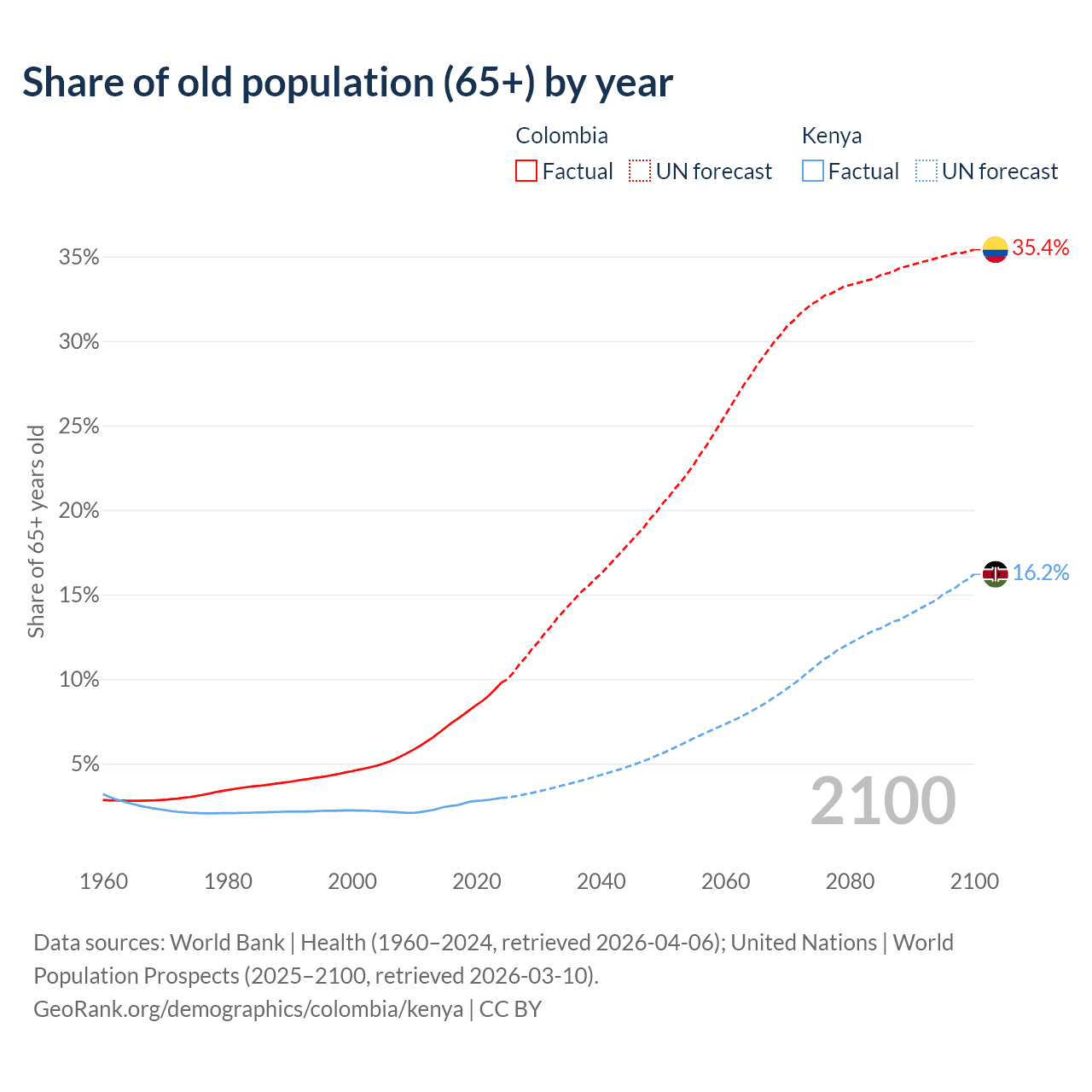 The share of older people aged 65 and over is 9.78% in Colombia and 2.97% in Kenya. Life expectancy in Colombia compared to Kenya .