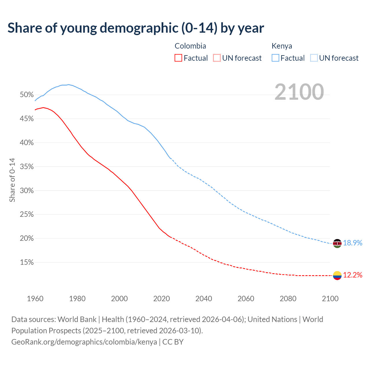 - The share of young demographic (0-15 years old) in Colombia is 20.3% vs 36.8% in Kenya.