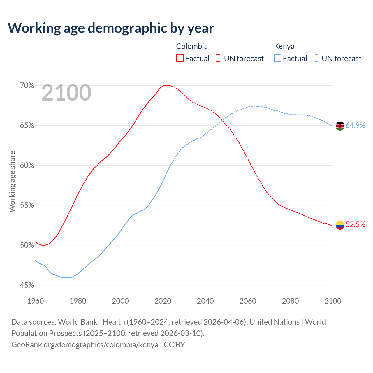 - Colombia has 37.8M working age adults (aged 15-64) vs 35.5M in Kenya.