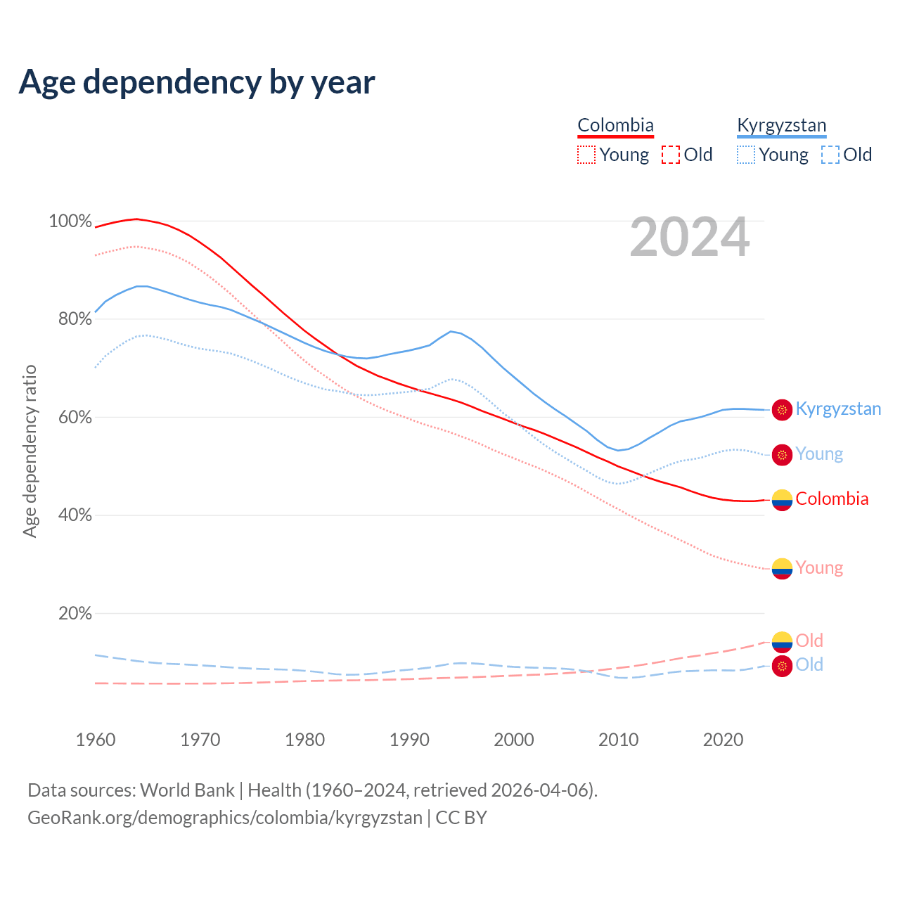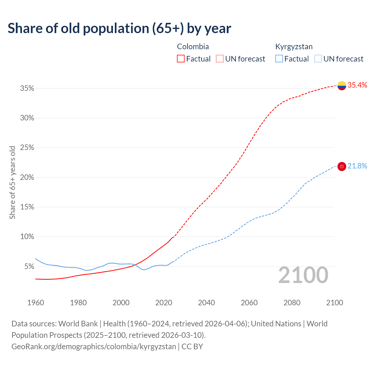 - The share of old-age demographic (65+) in Colombia is 9.78% vs 5.68% in Kyrgyzstan.