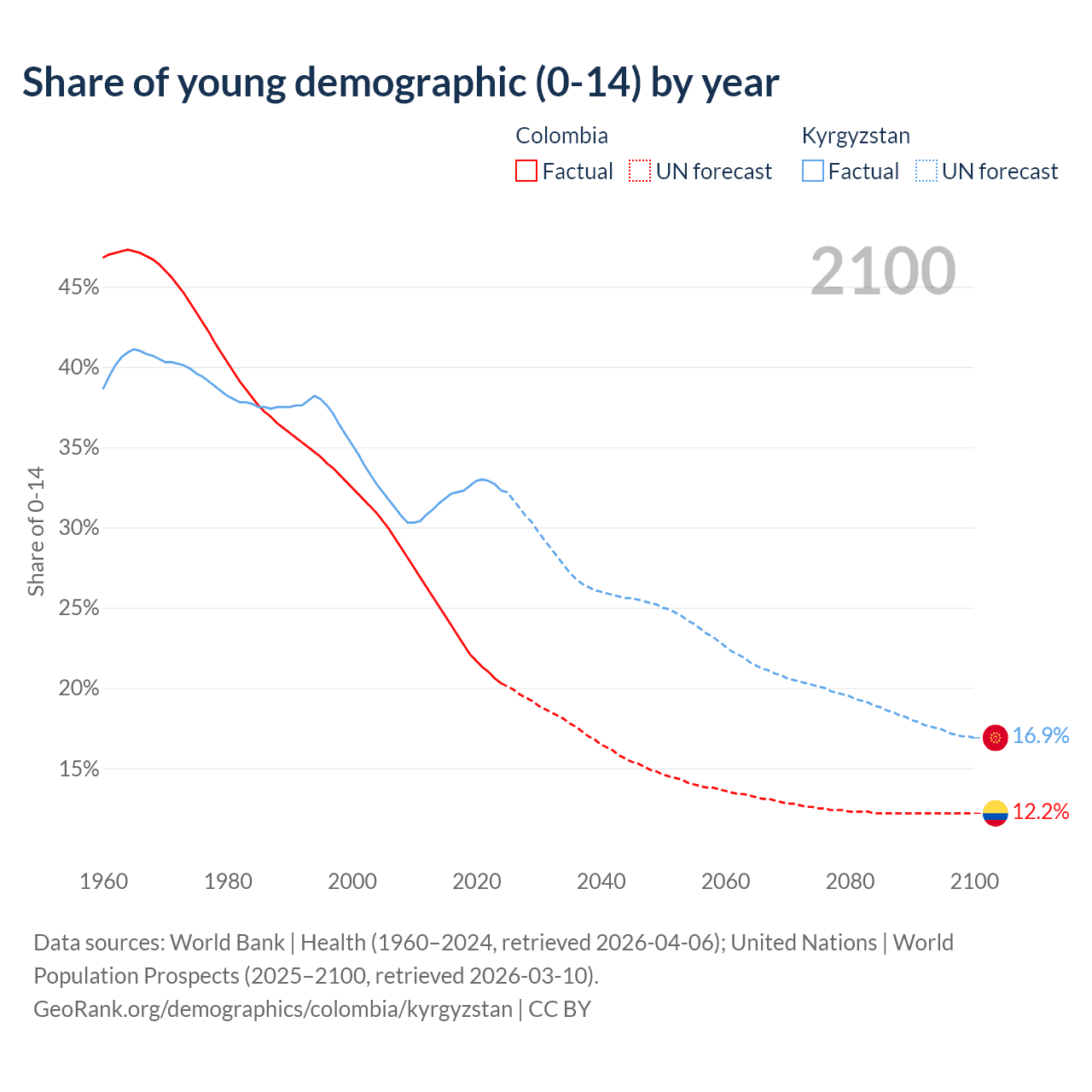 - The share of young demographic (0-15 years old) in Colombia is 20.3% vs 32.3% in Kyrgyzstan.