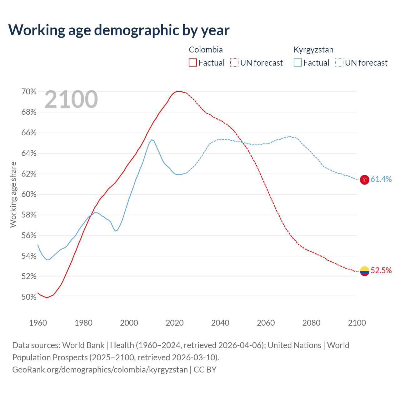 - Colombia has 37.8M working age adults (aged 15-64) vs 4.63M in Kyrgyzstan.